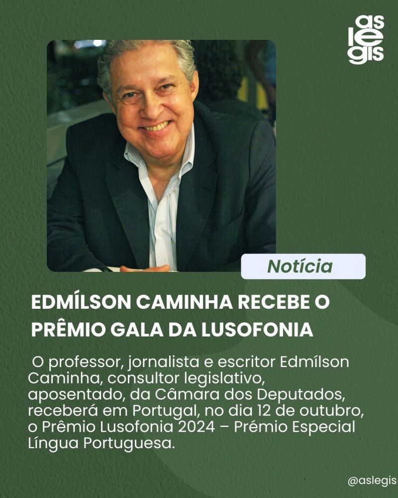 O professor, jornalista e escritor Edmílson Caminha, consultor legislativo, aposentado, da Câmara dos Deputados, receberá em Portugal, no dia 12 de outubro, o Prêmio Lusofonia 2024 – Prémio Especial Língua Portuguesa. Instituída há oito anos, pela Associação Internacional da Língua Portuguesa, a homenagem é feita, anualmente, a intelectuais e a artistas das nações lusófonas: Portugal, Brasil, Angola, Moçambique, São Tomé e Príncipe, Guiné-Bissau e Timor-Leste. Já a receberam o jurista José Ramos-Horta, Presidente da República de Timor-Leste, e os brasileiros Nélida Piñon, escritora, e Martinho da Vila, compositor e cantor.